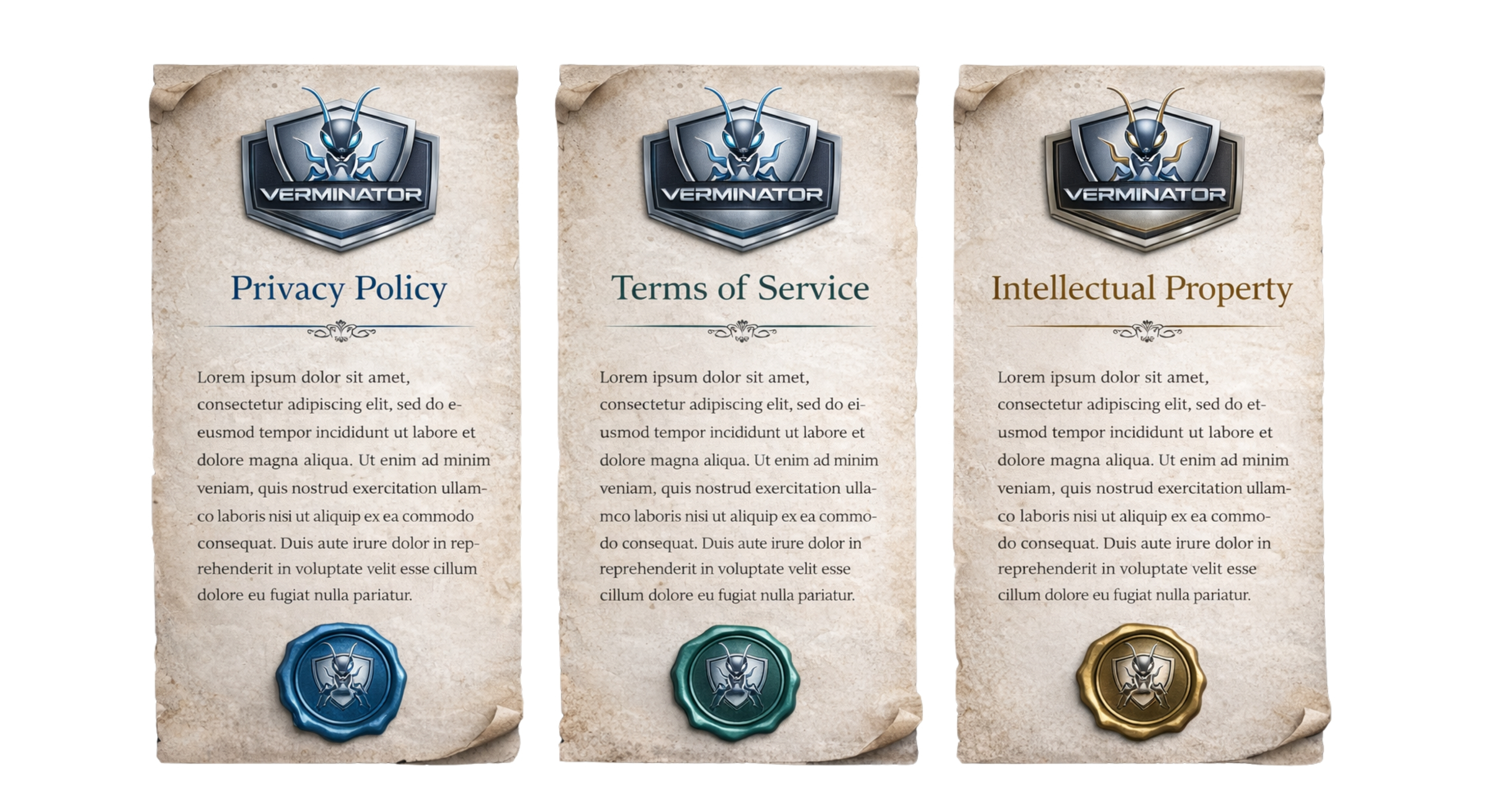 Unless otherwise stated, the content, design elements, graphics, page copy, layouts, proprietary section formats, and code on this website are owned by or licensed to Verminator and are protected by applicable intellectual property laws.